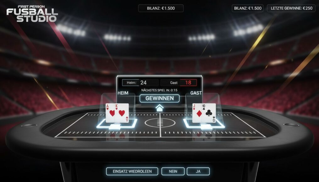 Evolution Gaming hat mit First Person Football Studio ein cleveres und unterhaltsames Kartenspiel geschaffen, das perfekt auf den deutschen Markt zugeschnitten ist. Die Verbindung zum beliebtesten Sport des Landes macht es sofort sympathisch und leicht zugänglich. Es ist eine hervorragende Wahl für Spieler, die ein schnelles, unkompliziertes Spiel mit einfachen Regeln suchen, ohne auf die Spannung eines Casino-Spiels verzichten zu wollen.
